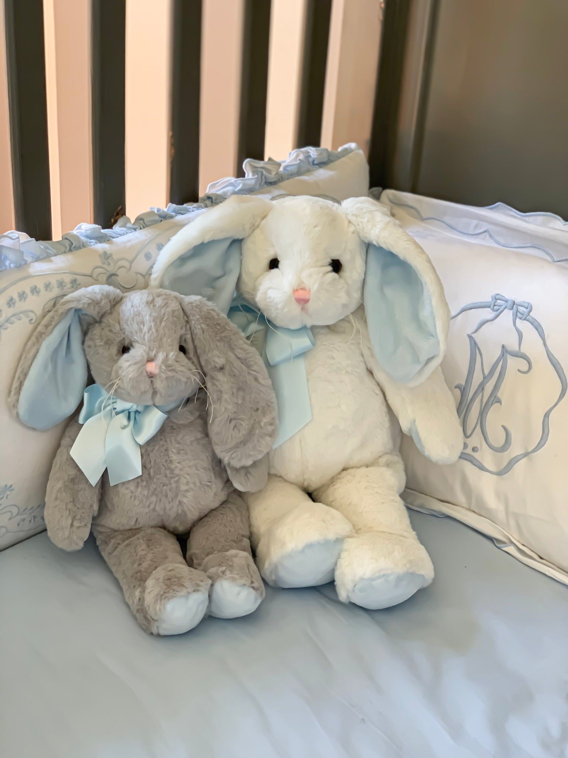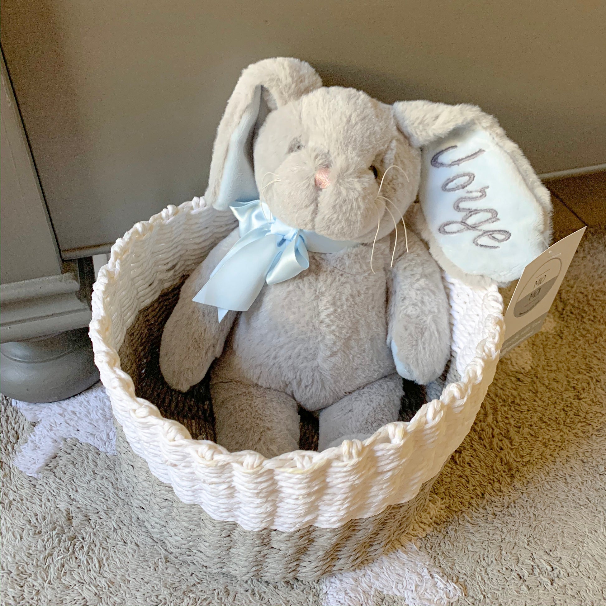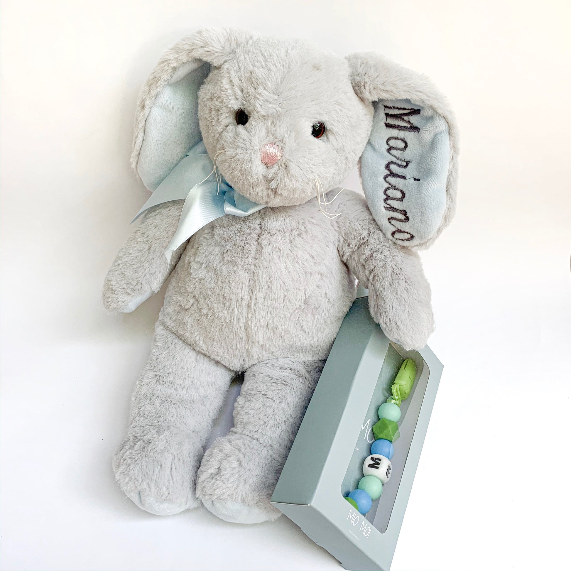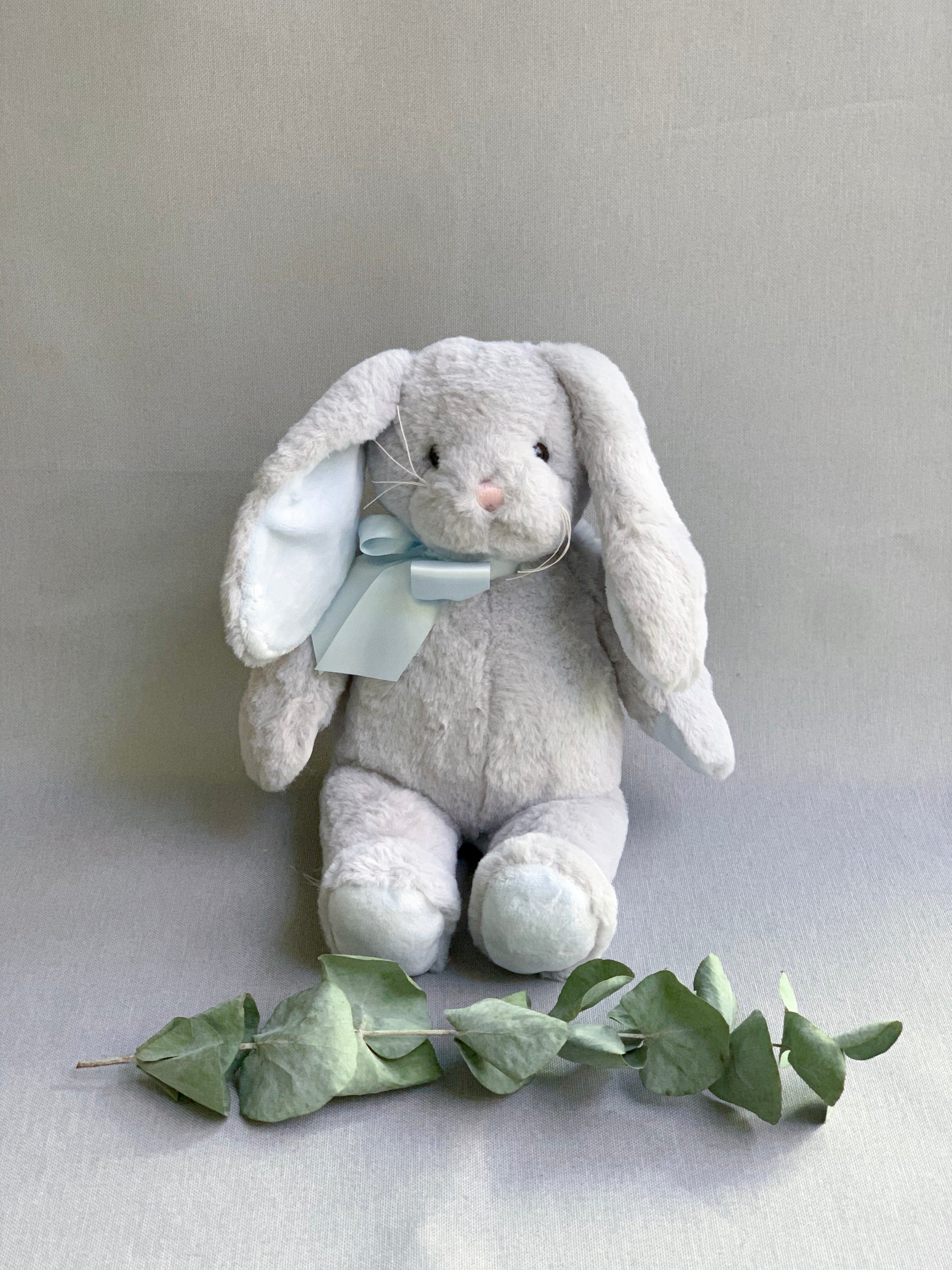 Conejo de peluche gris / oreja celeste