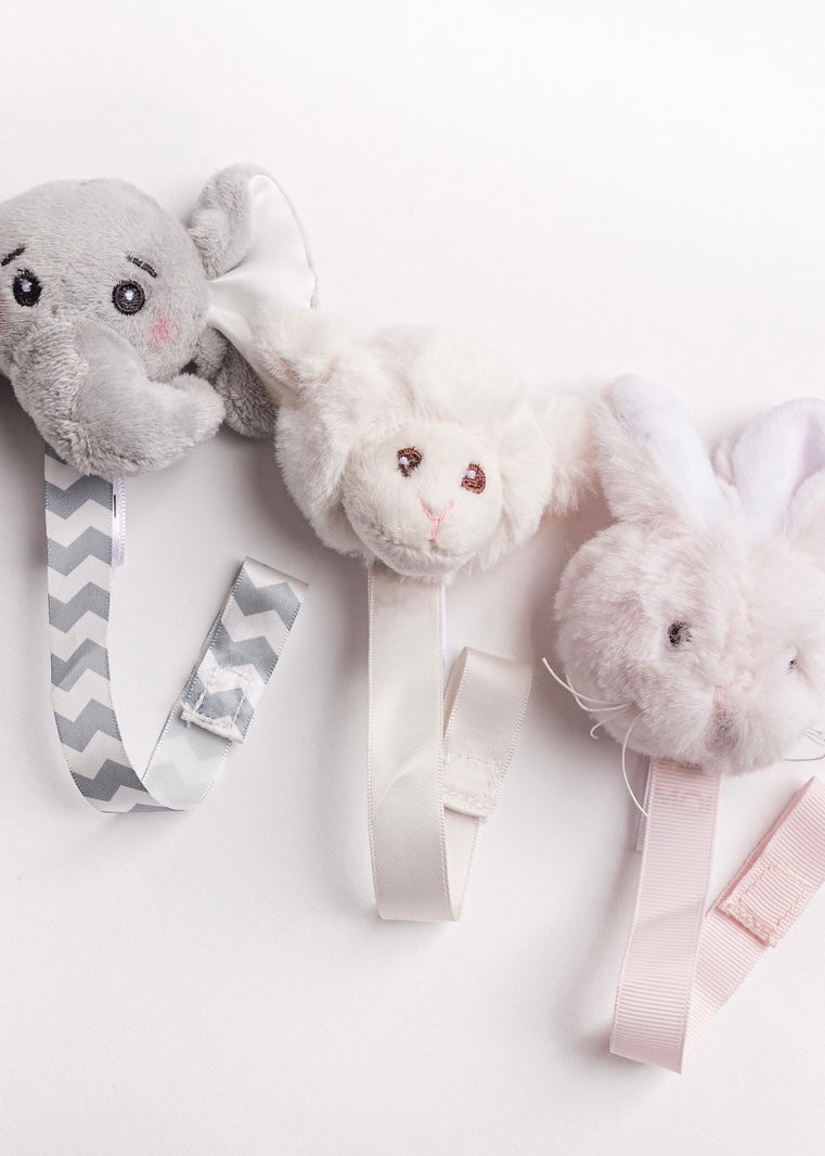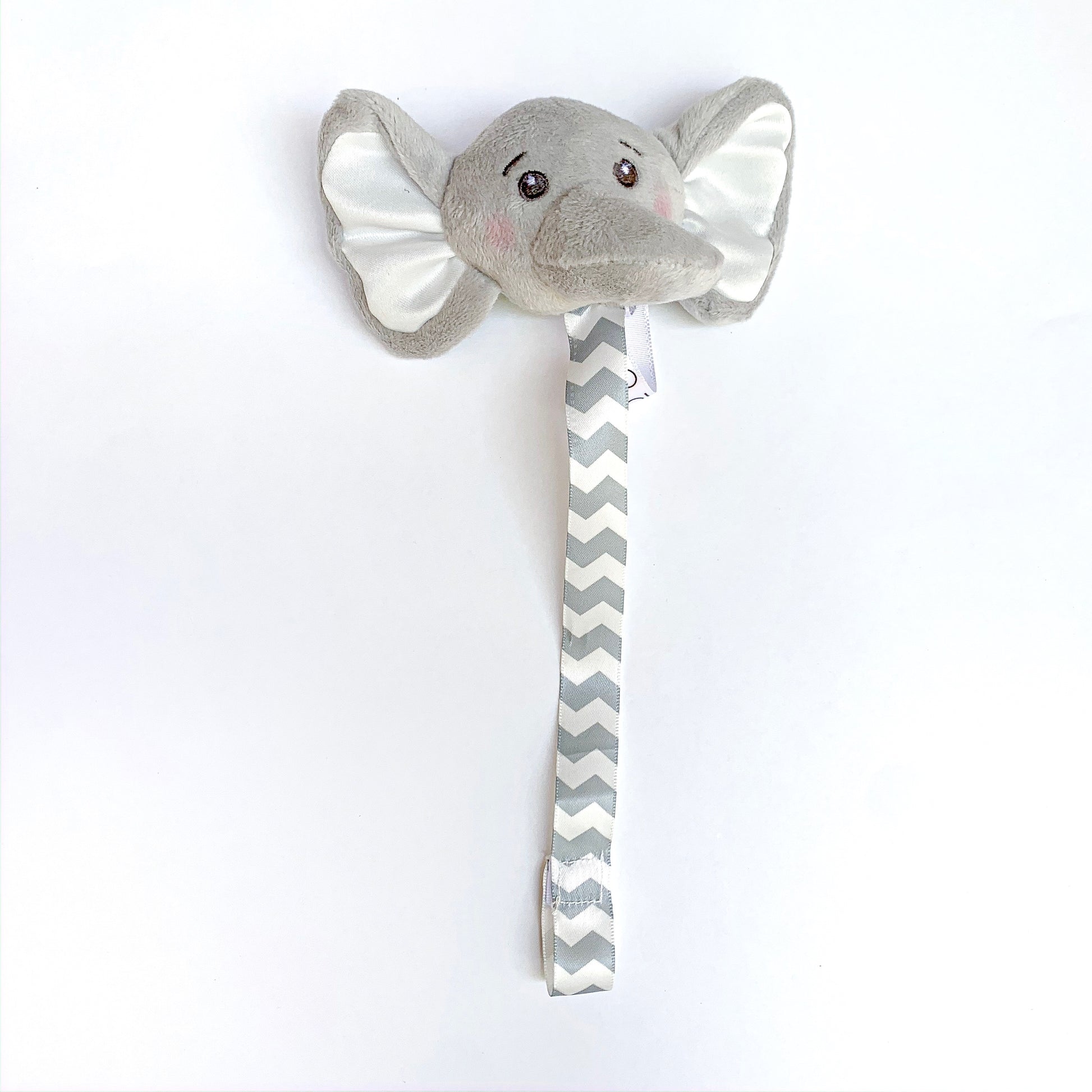 Portachupon de peluche en forma de elefante con sonaja integrada
